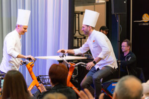 Daarna verscheen Jeroen Goossens ten tonele en onder zijn aanmoedigingen kwamen Peter, Tom en Bart vanuit alle hoeken van de beurs aangefietst. Op het podium deden zij samen uit de doeken wat dit allemaal in gaat houden en waarom, na zo’n lange periode van afwezigheid, deze patissiers de uitdaging aan gaan. Met een heel Dutch Pastry Team, een marketing team en bestuur onder aanvoering van een bevlogen Tamara Hoogerwaard en een grote groep enthousiaste partners, maar hopelijk ook het Nederlandse publiek achter zich, gaan zij er vol voor om hoge ogen te gooien op dit prachtige podium.
