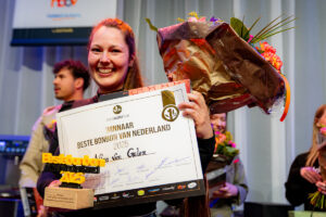 Met een indrukwekkend showstuk en een taartje waarbij vooral veel naar oma is geluisterd, wist Serena van Breukelen, productontwikkelaar bij Chocoladebezorgd, de jury te overtuigen. Zij werd uitgeroepen tot winnares van de Dutch Pastry Award 2025 en dus de beste patissier van Nederland voor 2025. Zij mag zich aspirant-lid van het DPT noemen en haar best gaan doen om in 2026 dat felbegeerde zwarte buisje te verkrijgen.