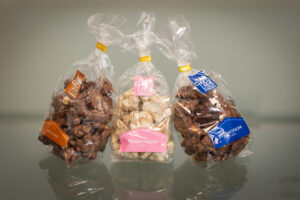 De Chocoladefabriek heeft vier productielijnen en circa vierhonderd productvarianten. Belangrijkste product zijn de ‘rotsjes’ met tegenwoordig niet alleen pinda’s, maar ook allerlei extra’s toegevoegd, zoals stroopwafeltjes, pepernootjes, karamel zeezoutvarianten enzovoort. ‘Daarnaast kun je bij De Chocoladefabriek ook terecht voor verrassende traktaties als zoute pretzels met een chocoladelaagje met decochelli’, vertelt Neef.