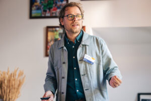 Jelmer behandelt het tweede onderwerp: Wat roept het woord AI op? De aanwezigen reageren direct: ‘handig’, ‘creatief, ‘vervanging van echte mensen’, ‘concurrentie’ en ‘snelheid’. Hij geeft een korte toelichting over kunstmatige intelligentie. ‘Kunstmatige intelligentie is slim, maar is slim gemáákt. Het is software, een gereedschap waar we iets mee kunnen doen. AI kan mega-efficiënt zijn. Als je het op de juiste manier inzet.’