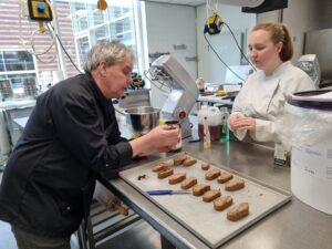 Vakdocent Jurjen Albertsma is enthousiast over dit uitstapje in het curriculum. ‘Het zou mooi zijn als dit een goed product oplevert, maar voor ons is het leerproces het belangrijkste. Studenten maken kennis met innovatie; hun wordt gevraagd om andere keuzes te maken dan te gaan voor de ingrediënten die voor de hand liggen in de bakkerij. Ook steunen we de gedachte achter dit project: het is tijd voor vernieuwing, met gezondere producten en minder voedselverspilling.’