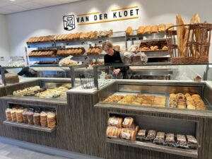 Hij vervolgt: ‘We hebben gekozen voor veel hout om het ambacht te benadrukken. De vitrine is strak en de wanden zijn licht. Aan de muren hangen afbeeldingen uit de ambachtelijke bakkerij. Zoals van onze bakker Lieuwe, die al meer dan veertig jaar bij ons in dienst is. Wij vinden het leuk om onze medewerkers terug te laten komen binnen onze organisatie.’